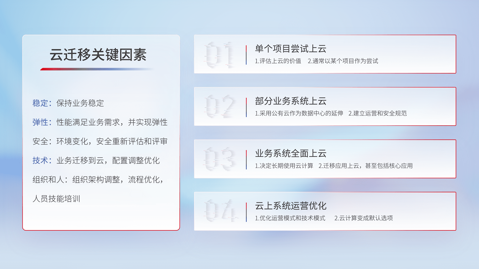 结合实际业务,,从规划设计、、云平台选型、、、、云原生改造、、、数据迁移、、、集成交付,,迁移全过程为客户识别最佳上云路径,,,做好风险识别管理,,,设计网络架构、、、身份权限、、安全审计合规、、、操作审计、、、、日志审计、、、、监控告警策略、、、多站点容灾设计等,,,对云上基础设施进行整体规划,,,,提升IT治理水平,,以满足弹性、、、、高可用、、、高性能的需求。。。。