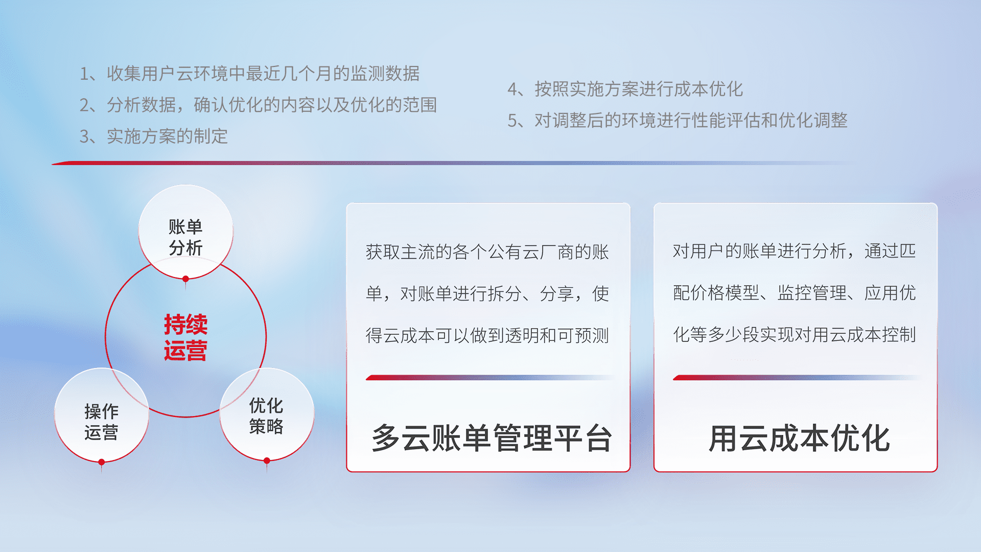通过多云纳管,,以统一的资源数据模型把客户的云资源进行抽象和封装,,进而实现对多云资源的统一操作,,保障云资源管理的可靠性、、、、稳定性与可用性。。量身定制化运维内容,,配置、、、开发运维、、、、补丁管理、、、备份、、监控、、、、认证和访问管理、、、审计和日常巡检等,,,,保障在用云过程中的可靠度,,稳定度以及高可用率。。